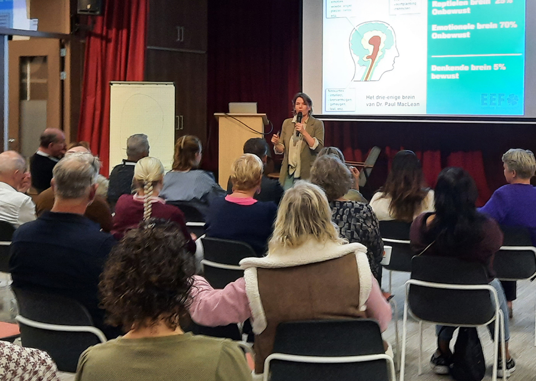 Eef deelde op een luchtige en speelse manier achtergrondinformatie over het omgaan met geld en hoe dat werkt in het menselijk brein. Ze gaf tips en tops over slimme financiële keuzes. Ook waarschuwde ze voor het gevaar en de verleiding van ‘achteraf betalen’.
